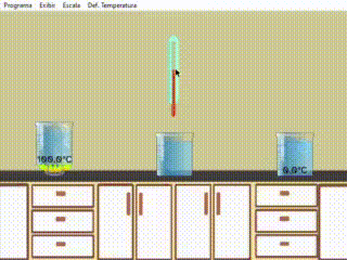 Este programa simula um experimento de termologia para construção de escalas termométricas. São apresentados 3 recipientes: o primeiro contém água no ponto de ebulição, o segundo contém água em uma temperatura desconhecida e o terceiro contém água no ponto de fusão. A ideia é utilizar o termoscópio presente na simulação e uma régua no mundo real para construir uma função termométrica que permita determinar qual é a temperatura da água no recipiente do meio. O programa suporta as escalas Celsius, Fahrenheit, Kelvin e uma escala X que pode ter os valores dos pontos fixos personalizados pelo usuário. Também é possível alterar e sortear o valor da temperatura do recipiente do meio.